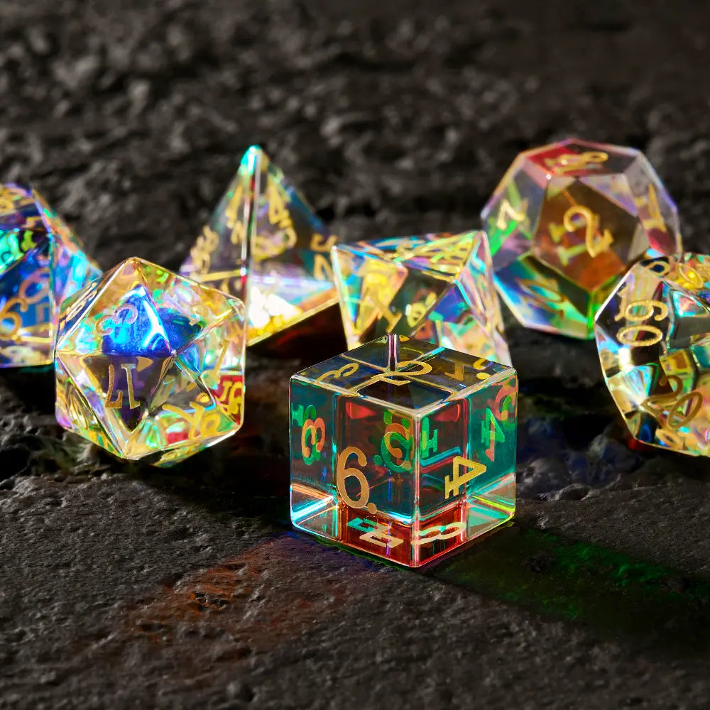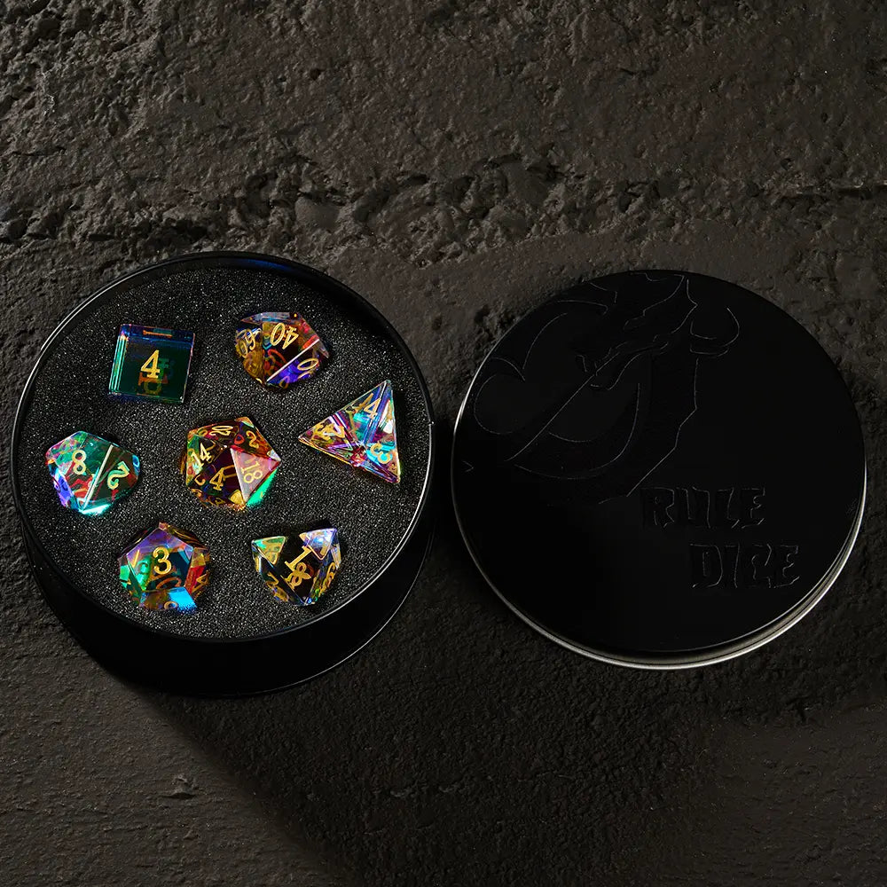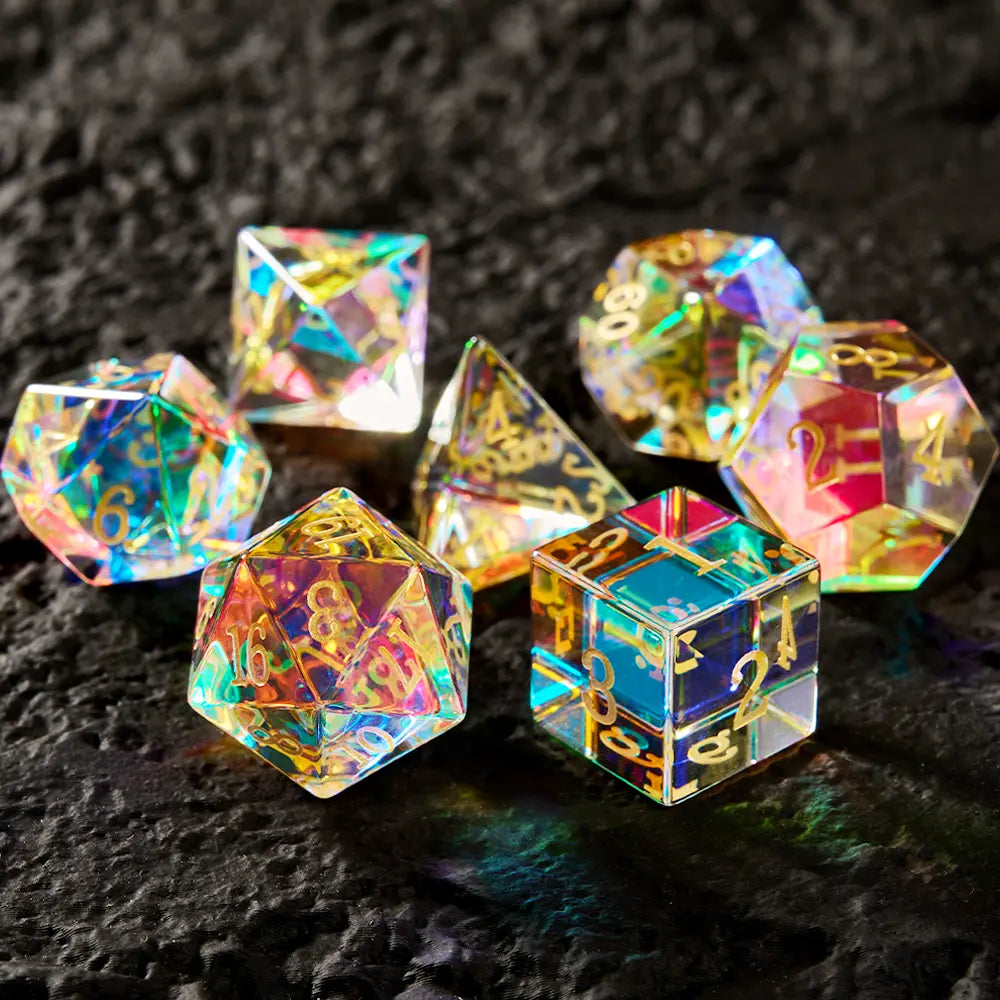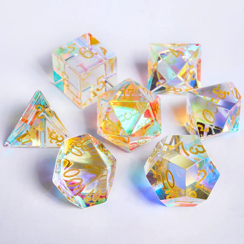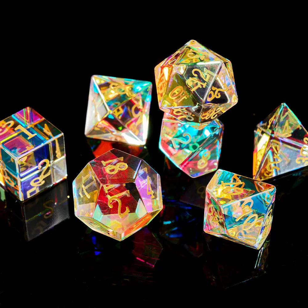 Premium Crystal : Crafted from pure, high-quality crystal, each die offers a smooth, polished finish that reflects light beautifully, creating a mesmerizing display of shifting colors. The colors change depending on the angle and lighting, making these dice a dynamic addition to any game.